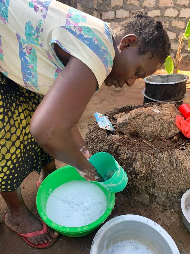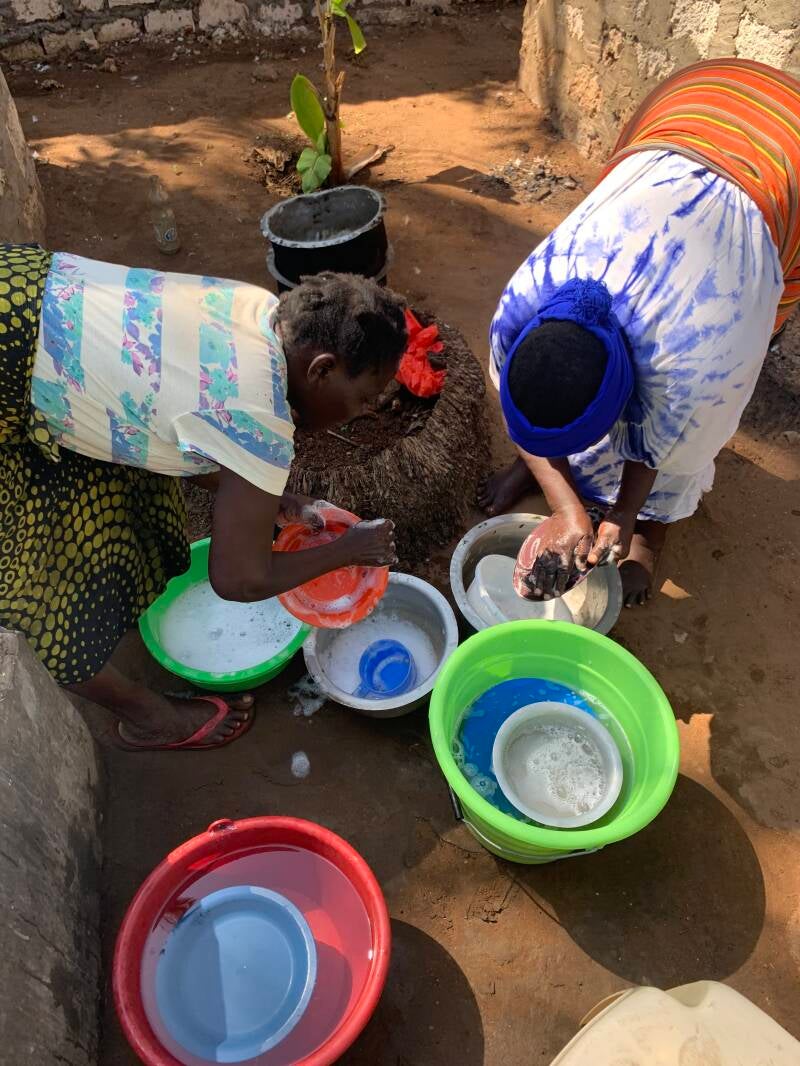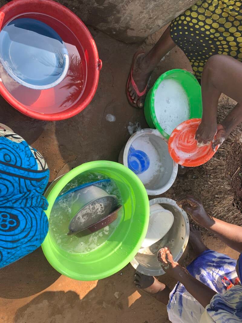 Gewaschen werden die Kleidungsstücke und das Geschirr mit der Hand.