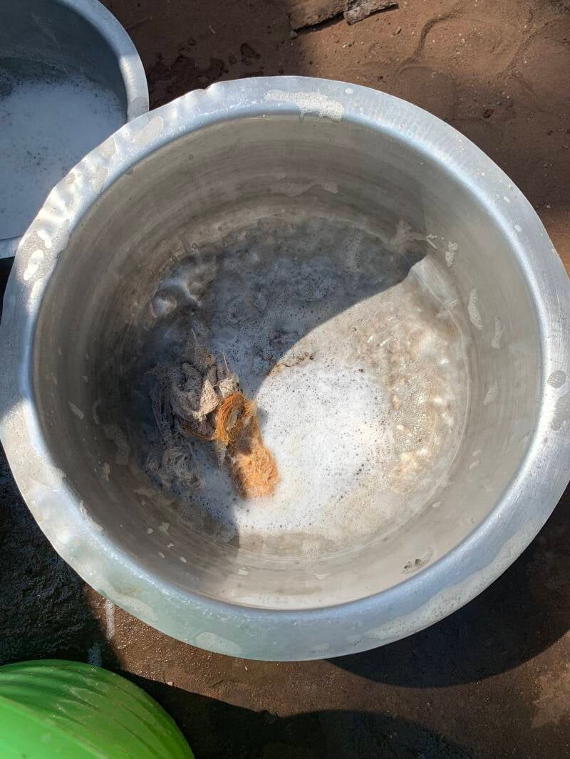 Um den groben Dreck zu entfernen wird die Natur genutzt. Die Fasern von getrockneten Palmenblättern werden zu einem kleinen Schwamm zusammen gerollt. Damit werden die Töpfe und Pfannen von hartnäckigen Rückständen befreit.
