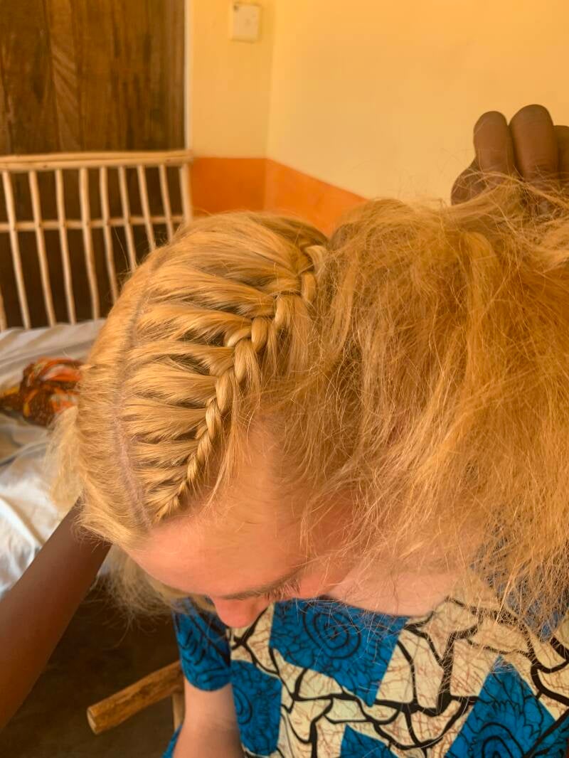 Hier ist es für die Kinder normal, dass die Haare straff gezogen werden und ganz eng geflochten werden. Regelmäßig schlafen die Kinder dabei sogar ein.