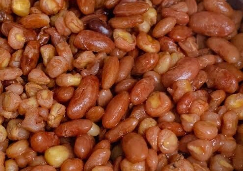 Die Maiskörner werden von der Haut gelöst  gemeinsam mit den Bohnen gekocht. Dies dauert eine Weile bis die Masse gut durch gekocht ist.